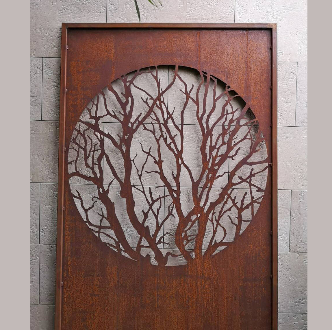 Paravent aus Rosteisen mit rundem Ausschnitt, Motiv Baumäste