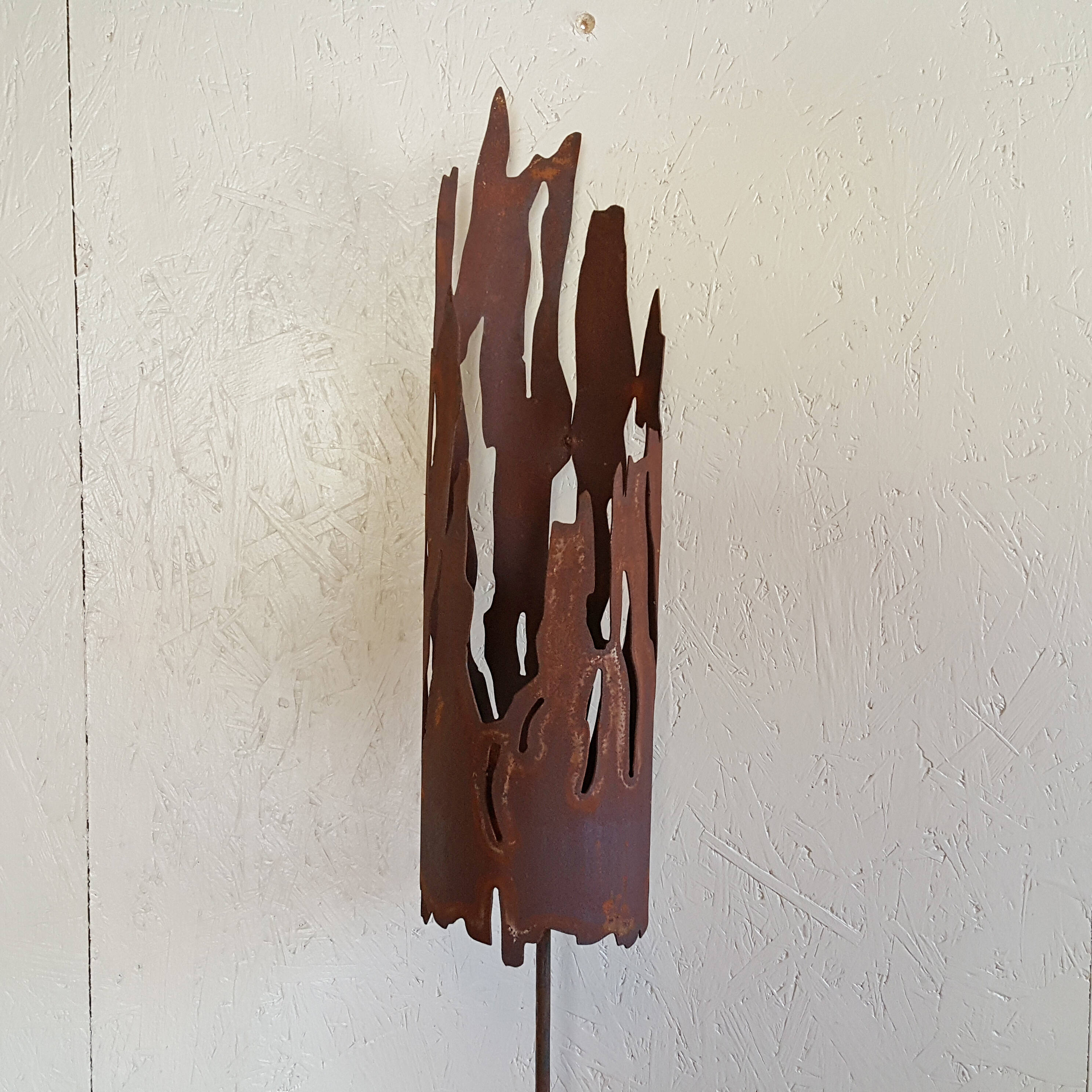 Windlicht Flamme aus Rostmetall, an einem Stab auf einer Platte