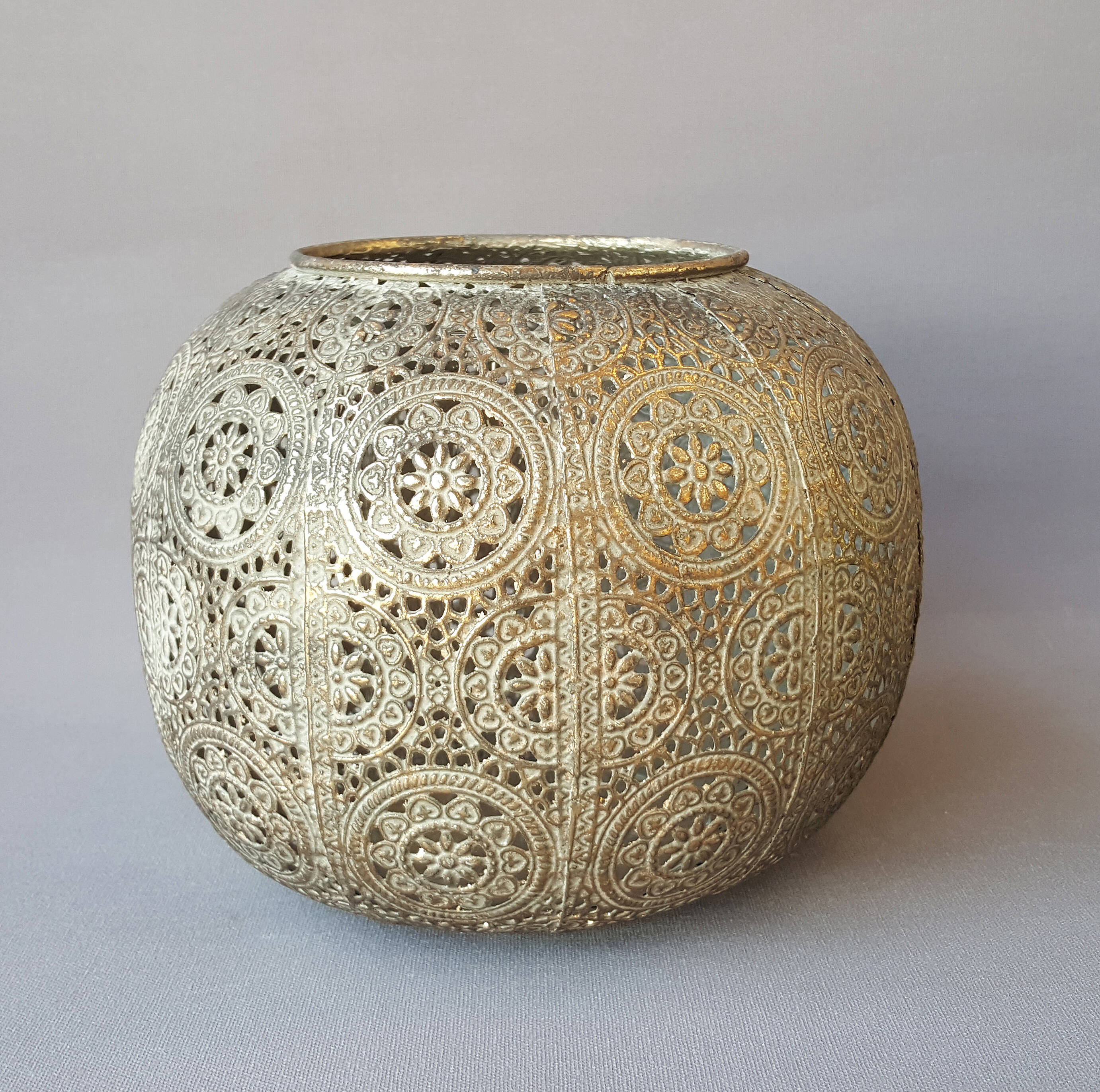Photophore en métal, finement découpé