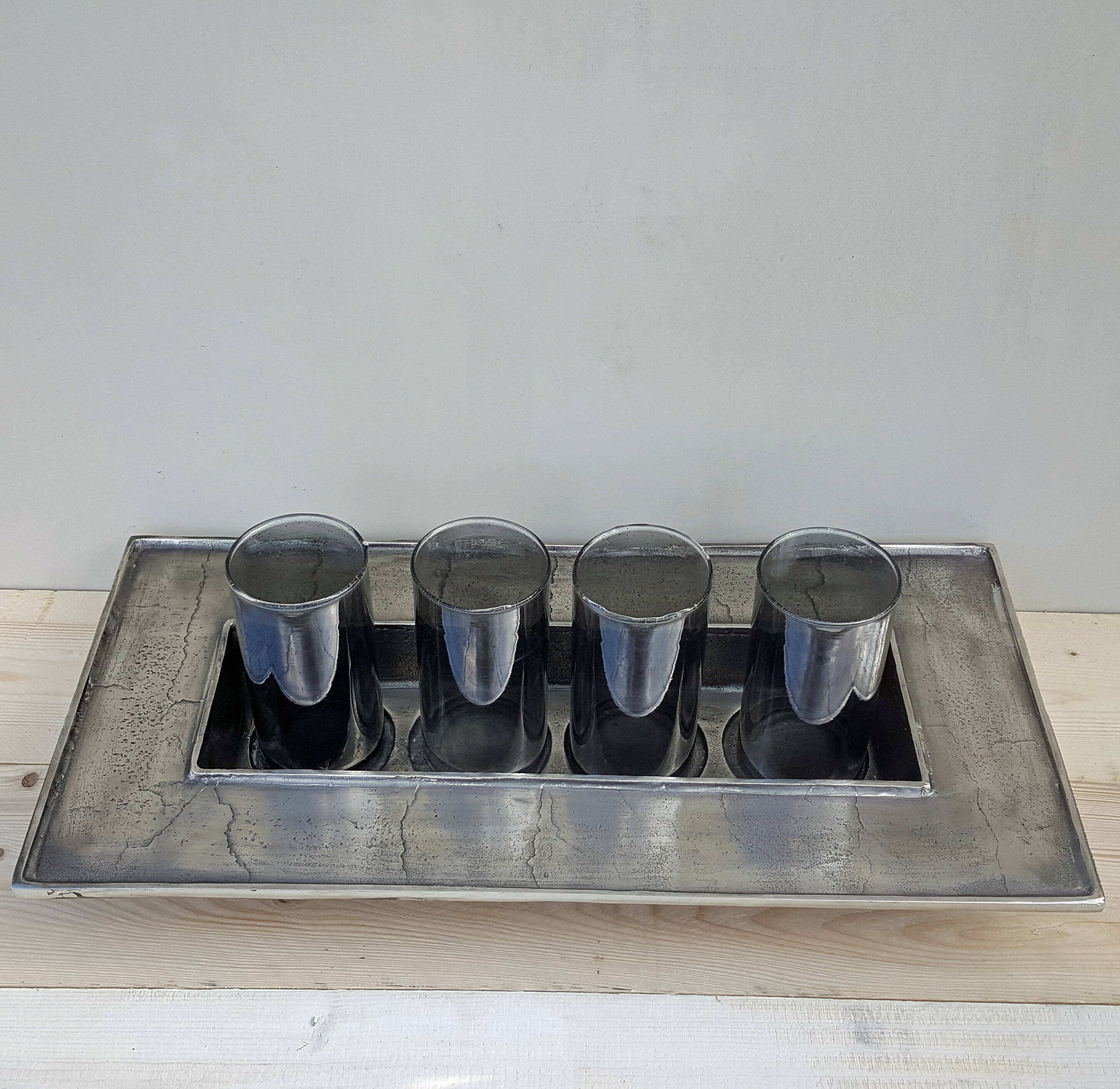 Plateau porte-bougies en métal argenté antique, 73 cm, largeur 36 cm pour 4 bougies.